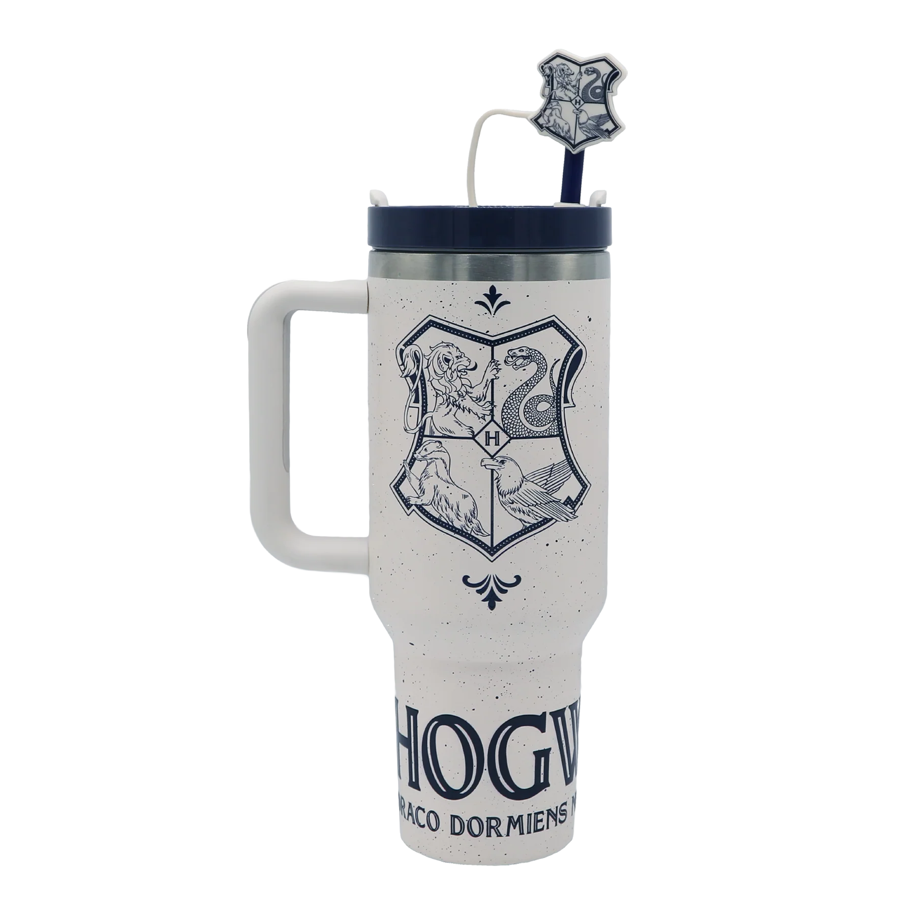 Measuring approximately 27 x 7 x 15cm, it features a comfortable ergonomic handle for easy carrying, topped with a twist-off blue lid and reusable straw. Crowning the straw is a delightful Hogwarts crest topper, adding a touch of charm worthy of any collector.