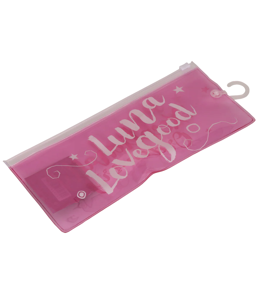 A pair of replica Spectrespecs, as worn by Luna Lovegood in Harry Potter and the Half-Blood Prince. These replica Spectrespecs are made of hard plastic, with a printed pattern across the frame. One lens is pink, and the other is blue. The Spectrespecs come in a protective plastic, zip-lock wallet which reads 'Luna Lovegood' on one side and 'Exceptionally Ordinary' on the reverse
